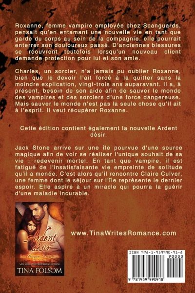 Édition Gros Caractères Roxanne, femme vampire employée chez Scanguards, pensait qu'en entamant une nouvelle vie en tant que garde du corps au sein de la compagnie, elle pourrait enterrer son douloureux passé. D'anciennes blessures se réouvrent toutefois lorsqu'un nouveau client demande protection pour lui et son amie. Charles, un sorcier, n'a jamais pu oublier Roxanne, bien que le devoir l'ait forcé à la quitter sans la moindre explication, vingt-trois ans auparavant. Il a, à présent, besoin de son aide afin de sauver le monde des vampires et des sorciers d'une force dangereuse. Mais sauver le monde n'est pas la seule chose qu'il ait à l'esprit. Il veut récupérer Roxanne. Cette édition contient également la nouvelle Ardent désir. Jack Stone arrive sur une île pourvue d'une source magique afin de voir se réaliser l'unique souhait de sa vie : redevenir mortel. En tant que vampire, il est fatigué de l'insatisfaisante vie empreinte de solitude qu'il a menée. C'est alors qu'il rencontre Claire Culver, une femme dont le séjour sur l'île représente le dernier espoir. Elle aspire à un miracle qui pourra la guérir d'une maladie incurable. Les Vampires Scanguards: Tome 1 - La belle mortelle de Samson Tome 2 - La provocatrice d'Amaury Tome 3 - La partenaire de Gabriel Tome 4 - L'enchantement d'Yvette Tome 5 - La rédemption de Zane Tome 6 - L'éternel amour de Quinn Tome 7 - Les désirs d'Oliver Tome 8 - Le choix de Thomas Tome 8 1/2 - Discrète morsure (Un mariage Scanguards) Tome 9 - L'identité de Cain Tome 10 - Le retour de Luther Tome 11 - La promesse de Blake Tome 11 1/2 - Fatidiques Retrouvailles Tome 12 - L'espoir der John Ardent désir (Une Nouvelle) Le Club des éternels célibataires : Tome 1 - Séduisant Tome 2 - Attirant Tome 3 - Envoûtant Tome 4 - Torride Tome 5 - Attrayant Tome 6 - Passionné