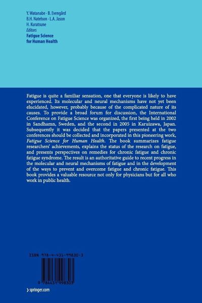 Fatigue is quite a familiar sensation, one that everyone is likely to have experienced. Its molecular and neural mechanisms have not yet been elucidated, however, probably because of the complicated nature of its causes. To provide a broad forum for discussion, the International Conference on Fatigue Science was organized, the first being held in 2002 in Sandhamn, Sweden, and the second in 2005 in Karuizawa, Japan. Subsequently it was decided that the papers presented at the two conferences should be collected and incorporated in this pioneering work, Fatigue Science for Human Health. The book summarizes fatigue researchers' achievements, explains the status of the research on fatigue, and presents perspectives on remedies for chronic fatigue and chronic fatigue syndrome. The result is an authoritative guide to recent progress in the molecular and neural mechanisms of fatigue and in the development of the ways to prevent and overcome fatigue and chronic fatigue. This book provides a valuable resource not only for physicians but for all who work in public health.