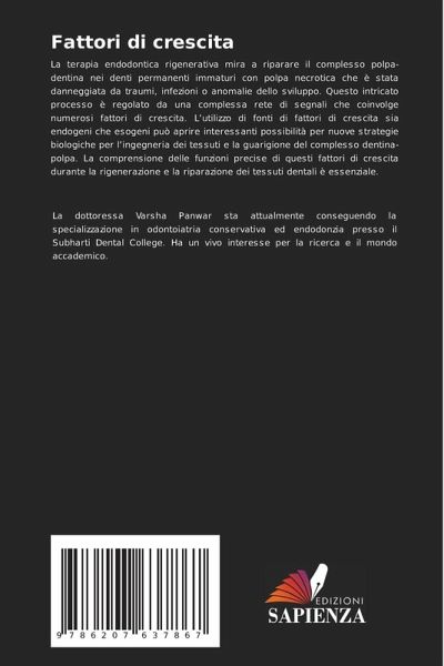 La terapia endodontica rigenerativa mira a riparare il complesso polpa-dentina nei denti permanenti immaturi con polpa necrotica che è stata danneggiata da traumi, infezioni o anomalie dello sviluppo. Questo intricato processo è regolato da una complessa rete di segnali che coinvolge numerosi fattori di crescita. L¿utilizzo di fonti di fattori di crescita sia endogeni che esogeni può aprire interessanti possibilità per nuove strategie biologiche per l¿ingegneria dei tessuti e la guarigione del complesso dentina-polpa. La comprensione delle funzioni precise di questi fattori di crescita durante la rigenerazione e la riparazione dei tessuti dentali è essenziale.