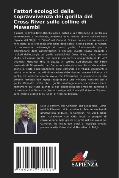 Il gorilla di Cross-River (Gorilla gorilla diehli) è la sottospecie di gorilla più settentrionale e occidentale, endemica delle foreste pluviali collinari della regione del "Bight of Biafra" nel Golfo di Guinea, la cui sopravvivenza è minacciata dalla crescente pressione della caccia e dalla perdita di habitat. La conoscenza dell'ecologia di questi gorilla, fondamentale per la pianificazione della conservazione, è limitata. Questo studio presenta i risultati dell'ecologia dei gorilla selvatici del Cross River, basati su uno studio sul campo durato due anni in una foresta non protetta di 43 km2 chiamata Mawambi Hills e situata al confine sud-orientale del Parco Nazionale di Takamanda, nel Camerun sud-occidentale. Lo studio analizza anche lo stato socio-economico delle comunità dei villaggi circostanti e valuta come le loro attività di estrazione delle risorse possano influenzare i gorilla. La presente ricerca rivela che l'estrazione di legname e di vari prodotti forestali non legnosi rappresenta una minaccia concreta per i gorilla. Dimostra inoltre che i gorilla mantengono una dieta diversificata, consumano più frutta quando la sua disponibilità nell'ambiente aumenta e ricorrono a cibo fibroso non fruttato nei periodi di scarsità di frutta. Tuttavia, sono esposti a periodi più lunghi di scarsità di frutta.