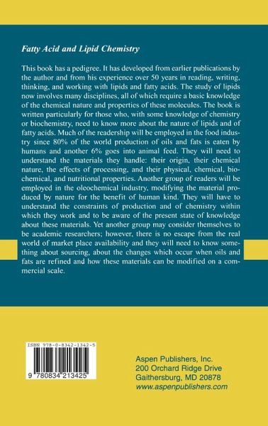 This book has pedigree. It has developed from experience over 50 years in reading, writing, thinking, and working with lipids and fatty acids. The study of lipids now involves many disciplines, all of which require a basic knowledge of the chemical nature and properties of these molecules. The book is written particularly for those who, with some knowledge of chemistry or biochemistry, need to know more about the mature of lipids and of fatty acids. It covers the materials they handle; their origin and chemical nature, the effects of processing, and their physical, chemical, biochemical, and nutritional properties. Another group of readers will be employed in the oleochemical industry modifying the material produced by nature for the benefit of human kind. They will have to understand the constraints of production and of chemistry within which they work and to be aware of the present state of knowledge about these materials. Yet another group may consider themselves tobe academic researchers; however there is no escape from the real world of market place availability and they will need to know something about sourcing, about the changes which occur when oils and fat are refined and how these materials can be modified on a commercial scale.
