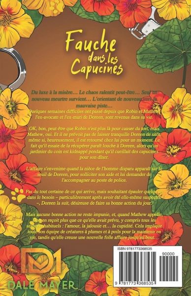Du luxe à la misère... Le chaos ralentit peut-être... Seul un nouveau meurtre survient... L'orientant de nouveau vers la mauvaise piste... Quelques semaines difficiles ont passé depuis que Robin et Mathew, l'ex-avocate et l'ex-mari de Doreen, sont revenus dans sa vie. OK, bon, peut-être que Robin n'est plus là pour causer du tort, mais Mathew, oui. Et il ne prévoit pas de laisser tranquille Doreen de sitôt, même si, heureusement, il est retourné chez lui pour un moment. Le fait qu'il essaie de la récupérer paraît louche à Doreen, alors qu'un jardinier du coin est kidnappé pendant qu'il cueillait des capucines pour son dîner. L'affaire s'envenime quand la nièce de l'homme disparu apparaît sur le seuil de Doreen, pour solliciter son aide et lui demander de l'accompagner au poste de police. Pas du tout certaine de ce qui arrive, mais souhaitant épauler quelqu'un dans le besoin - particulièrement après avoir été elle-même suspectée -, Doreen la suit, désireuse de faire sa bonne action du jour. Mais aucune bonne action ne reste impunie, et, quand Mathew appelle, Doreen reçoit plus que ce qu'elle avait prévu, y compris tous les suspects habituels : l'amour, la jalousie et... la cupidité. Cela implique toute son équipe de créatures à plumes et à poils pour la maintenir en vie, tandis qu'elle creuse une nouvelle folle affaire jusqu'au bout...