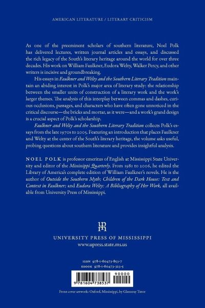 Valuable scholarship from a leading textual critic As one of the preeminent scholars of southern literature, Noel Polk has delivered lectures, written journal articles and essays, and discussed the rich legacy of the South's literary heritage around the world for over three decades. His work on William Faulkner, Eudora Welty, Walker Percy, and other writers is incisive and groundbreaking. His essays in Faulkner and Welty and the Southern Literary Tradition maintain an abiding interest in Polk's major area of literary study: the relationship between the smaller units of construction in a literary work and the work's larger themes. The analysis of this interplay between commas and dashes, curious occlusions, passages, and characters who have often gone unnoticed in the critical discourse--the bricks and mortar, as it were--and a work's grand design is a crucial aspect of Polk's scholarship. Faulkner and Welty and the Southern Literary Tradition collects Polk's essays from the late-1970s to 2005. Featuring an introduction that places Faulkner and Welty at the center of the South's literary heritage, the volume asks useful, probing questions about southern literature and provides insightful analysis. Noel Polk is professor of English at Mississippi State University and editor of the Mississippi Quarterly. From 1981 to 2006, he edited the Library of America's complete edition of William Faulkner's novels. He is the author of Outside the Southern Myth; Children of the Dark House: Text and Context in Faulkner; and Eudora Welty: A Bibliography of Her Work.