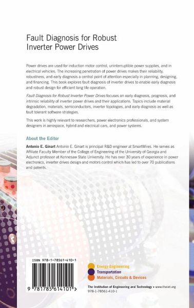 * Chapter 1: Fundamentals for reliability and early diagnosis for inverter power drives * Chapter 2: Early diagnosis in power semiconductors: MOSFET, IGBT, emerging materials (SiC and GaNs) * Chapter 3: Early diagnosis in DC-link capacitors: electrolytic and films * Chapter 4: Embedded fault diagnosis and prognosis * Chapter 5: Fault-tolerance strategies for power converters * Chapter 6: Motor diagnostics and protection using inverter capabilities * Chapter 7: Battery storage * Chapter 8: Prognostics: a battery case study