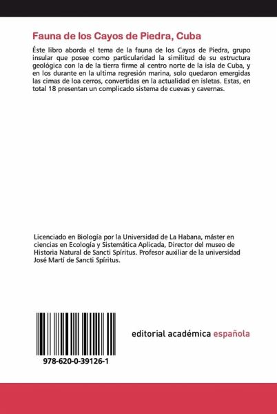 Éste libro aborda el tema de la fauna de los Cayos de Piedra, grupo insular que posee como particularidad la similitud de su estructura geológica con la de la tierra firme al centro norte de la isla de Cuba, y en los durante en la ultima regresión marina, solo quedaron emergidas las cimas de loa cerros, convertidas en la actualidad en isletas. Estas, en total 18 presentan un complicado sistema de cuevas y cavernas.