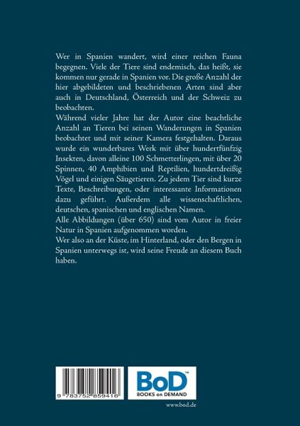Wer in Spanien wandert, wird einer reichen Fauna begegnen. Viele der Tiere sind endemisch, das heißt, sie kommen nur gerade in Spanien vor. Die große Anzahl der hier abgebildeten und beschriebenen Arten sind aber auch in Deutschland, Österreich und der Schweiz zu beobachten.Während vieler Jahre hat der Autor eine beachtliche Anzahl an Tieren bei seinen Wanderungen in Spanien beobachtet und mit seiner Kamera festgehalten. Daraus wurde ein wunderbares Werk mit über hundertfünfzig Insekten, davon alleine 100 Schmetterlingen, mit über 20 Spinnen, 40 Amphibien und Reptilien, hundertdreißig Vögel und einigen Säugetieren. Zu jedem Tier sind kurze Texte, Beschreibungen, oder interessante Informationen dazu geführt. Außerdem alle wissenschaftlichen, deutschen, spanischen und englischen Namen. Alle Abbildungen (über 650) sind vom Autor in freier Natur in Spanien aufgenommen worden.Wer also an der Küste, im Hinterland, oder den Bergen in Spanien unterwegs ist, wird seine Freude an diesem Buch haben.