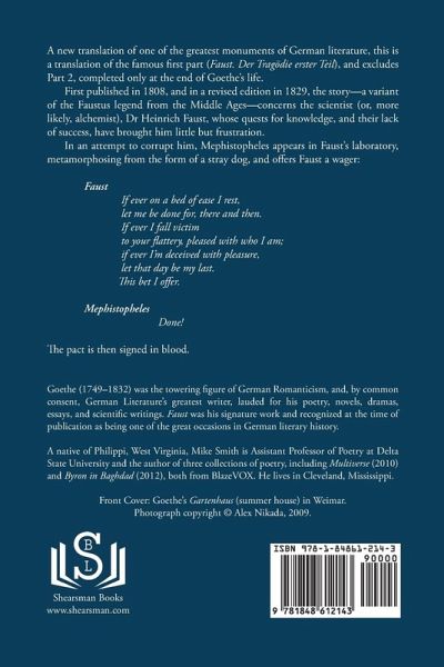 Faust occupies a central place in German literature, as the magnum opus of its greatest writer, as one of its greatest dramas, and as an epic poem of the highest quality, for, although it was written to be performed, it may also be regarded as a dramatic poem, prophetic perhaps of Berlioz's hybrid musical adaptation in 'La Damnation de Faust'.The Faust story caught Goethe's attention from an early stage and the first published results of his engagement with it was 'Faust. A Fragment', published in 1790. He had however written a dramatic treatment of the story in his 20s, a fact which only became apparent over a century later, when the papers of Luisa von Göchhausen, a lady of the court of Weimar, were found to contain a transcription of this work, since known as the 'Urfaust' (Original Faust). This early work was published in 1887. 'Faust. A Tragedy, Part One' was finally completed in 1808 and was later revised and published in a new edition in 1829. The third act of Part 2 appeared in 1827, part of the first act a year later, and the complete text in 1832, shortly after the author's death. The entirety of 'Faust', parts 1 and 2 together, was performed for the first time in 1875, in Weimar. The translation presented in this volume encompasses only Part One, which is usually performed without its cerebral pendant piece, and remains the keystone of Goethe's career.