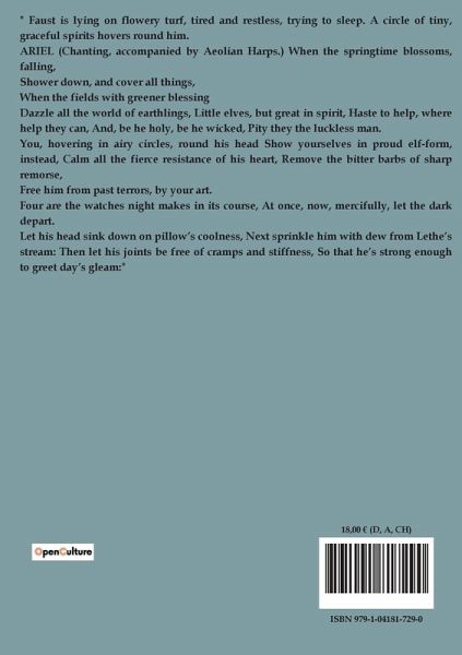 " Faust is lying on flowery turf, tired and restless, trying to sleep. A circle of tiny, graceful spirits hovers round him. ARIEL (Chanting, accompanied by Aeolian Harps.) When the springtime blossoms, falling, Shower down, and cover all things, When the fields with greener blessing Dazzle all the world of earthlings, Little elves, but great in spirit, Haste to help, where help they can, And, be he holy, be he wicked, Pity they the luckless man. You, hovering in airy circles, round his head Show yourselves in proud elf-form, instead, Calm all the fierce resistance of his heart, Remove the bitter barbs of sharp remorse, Free him from past terrors, by your art. Four are the watches night makes in its course, At once, now, mercifully, let the dark depart. Let his head sink down on pillow¿s coolness, Next sprinkle him with dew from Lethe¿s stream: Then let his joints be free of cramps and stiffness, So that he¿s strong enough to greet day¿s gleam:"