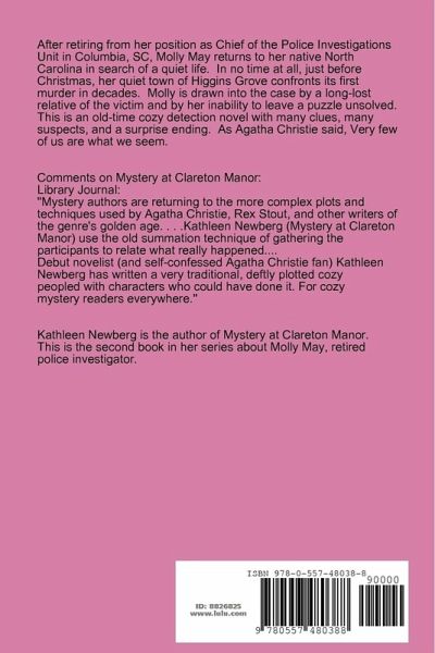 After retiring from her position as Chief of the Police Investigations Unit in Columbia, SC, Molly May returns to her native North Carolina in search of a quiet life. In no time at all, just before Christmas, her quiet town of Higgins Grove confronts its first murder in decades. Molly is drawn into the case by a long-lost relative of the victim and by her inability to leave a puzzle unsolved. This is an old-time cozy detection novel with many clues, many suspects, and a surprise ending. As Agatha Christie said, Very are what we seem.