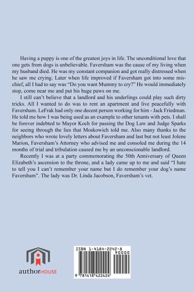 Having a puppy is one of the greatest joys in life. The unconditional love that one gets from dogs is unbelievable. Faversham was the cause of my living when my husband died. He was my constant companion and got really distressed when he saw me crying. Later when life improved if Faversham got into some mischief, all I had to say was "Do you want Mummy to cry? He would immediately stop, come near me and put his hugh paws on me. I still can't believe that a landlord and his underlings could play such dirty tricks. All I wanted to do was to rent an apartment and live peacefully with Faversham. LeFrak had only one decent person working for him - Jack Friedman. He told me how I was being used as an example to other tenants with pets. I shall be forever indebted to Major Koch for passing the Dog Law and Judge Sparks for seeing through the lies that Moskowich told me. Also many thanks to the neighbors who wrote lovely letters bout Faversham and last but not least Jolene Marion, Faversham's Attorney who advised me and consold me during the 14 months of trial and tribulation caused me by an unconscionable landlord. Recently I was at a party commemorating the 50th Anniversary of Queen Elizabeth's ascension to the throne, and a lady came up to me and said "I hate to tell you I can't remember your name but I do remember your dog's name Faversham". The lady was Dr. Linda Jacobson, Faversham's vet.