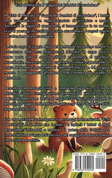 "Echi di Mistralia: Il Viaggio dei Bambini di Arcobaleno" In "Echi di Mistralia: Il Viaggio dei Bambini di Arcobaleno", i lettori sono trasportati in un regno incantato di avventure e magia. Attraverso le pagine di questo libro, si immergeranno in un mondo ricco di paesaggi mozzafiato, creature straordinarie e segreti antichi che attendono di essere scoperti. La storia segue il viaggio epico dei bambini di Arcobaleno mentre si avventurano nelle terre misteriose di Mistralia, un regno dove il vento porta con sé segreti millenari e promesse di avventure straordinarie. Attraverso le loro esperienze, i lettori esploreranno la magia del vento e impareranno il valore dell'amicizia e del coraggio mentre i protagonisti affrontano sfide sempre più grandi e pericolose. Descritto con dettagli vividi e immagini suggestive, "Echi di Mistralia" cattura l'immaginazione dei lettori di tutte le età. Le pagine del libro sono intrise di magia e avventura, trasportando i lettori in un viaggio indimenticabile attraverso terre incantate e città sospese tra le nuvole. Con una narrazione coinvolgente e personaggi indimenticabili, "Echi di Mistralia" è un libro che incanterà e ispirerà i lettori di ogni generazione, invitandoli a esplorare il potere della fantasia e a credere nell'importanza dell'amicizia e del coraggio in ogni avventura che la vita ha da offrire.