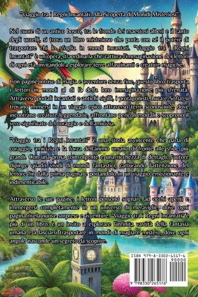 "Viaggio tra i Regni Incantati: Alla Scoperta di Monidi Misteriosi" Nel cuore di un antico bosco, tra le fronde dei maestosi alberi e il canto degli uccelli, si trova un libro misterioso che porta con sé il potere di trasportare chi lo sfoglia in mondi incantati. "Viaggio tra i Regni Incantati" è un'opera straordinaria che cattura l'immaginazione dei lettori di ogni età, invitandoli a esplorare terre affascinanti e creature magiche. Con pagine intrise di magia e avventure senza fine, questo libro trasporta i lettori in mondi al di là della loro immaginazione più sfrenata. Attraverso portali incantati e antichi sigilli, i protagonisti, Luca e Sofia, si trovano immersi in un viaggio epico attraverso terre sconosciute, dove incontrano creature leggendarie, affrontano pericoli mortali e scoprono il vero significato del coraggio e dell'amicizia. "Viaggio tra i Regni Incantati" è una storia avvincente che parla di coraggio, amicizia e la forza dell'animo umano di fronte alle sfide più grandi. Con una prosa coinvolgente e una ricchezza di dettagli, l'autore dipinge quadri vividi di mondi fantastici, catturando l'attenzione del lettore fin dalla prima pagina e portandolo in un viaggio emozionante e indimenticabile. Attraverso le sue pagine, i lettori possono sognare ad occhi aperti e immergersi completamente in un universo di meraviglie, dove ogni pagina rivela nuove sorprese e avventure. "Viaggio tra i Regni Incantati" è più di un libro: è un invito a esplorare l'infinita vastità della fantasia umana e a lasciarsi trasportare in mondi di magia e mistero, dove ogni angolo nasconde un segreto da scoprire.