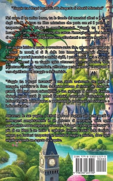 "Viaggio tra i Regni Incantati: Alla Scoperta di Monidi Misteriosi" Nel cuore di un antico bosco, tra le fronde dei maestosi alberi e il canto degli uccelli, si trova un libro misterioso che porta con sé il potere di trasportare chi lo sfoglia in mondi incantati. "Viaggio tra i Regni Incantati" è un'opera straordinaria che cattura l'immaginazione dei lettori di ogni età, invitandoli a esplorare terre affascinanti e creature magiche. Con pagine intrise di magia e avventure senza fine, questo libro trasporta i lettori in mondi al di là della loro immaginazione più sfrenata. Attraverso portali incantati e antichi sigilli, i protagonisti, Luca e Sofia, si trovano immersi in un viaggio epico attraverso terre sconosciute, dove incontrano creature leggendarie, affrontano pericoli mortali e scoprono il vero significato del coraggio e dell'amicizia. "Viaggio tra i Regni Incantati" è una storia avvincente che parla di coraggio, amicizia e la forza dell'animo umano di fronte alle sfide più grandi. Con una prosa coinvolgente e una ricchezza di dettagli, l'autore dipinge quadri vividi di mondi fantastici, catturando l'attenzione del lettore fin dalla prima pagina e portandolo in un viaggio emozionante e indimenticabile. Attraverso le sue pagine, i lettori possono sognare ad occhi aperti e immergersi completamente in un universo di meraviglie, dove ogni pagina rivela nuove sorprese e avventure. "Viaggio tra i Regni Incantati" è più di un libro: è un invito a esplorare l'infinita vastità della fantasia umana e a lasciarsi trasportare in mondi di magia e mistero, dove ogni angolo nasconde un segreto da scoprire.
