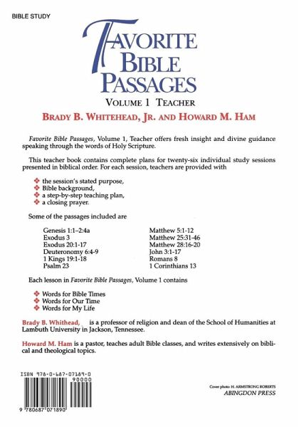 This teacher book contains complete plans for 26 individual study sessions presented in biblical order. For each session, teachers are provided with: the session's stated purpose Bible background a step-by-step teaching plan a closing prayer Sessions: Genesis 1:1-2:4a It Was Good Genesis 2 God's Promise to Abram Exodus 3 Moses Encounters God Exodus 20:1-17 The Ten Commandments Deuteronomy 6:4-9 The Great Commandment Joshua 24:1-18 We Will Serve the Lord Ruth 1:1-18; 4:13-17 Where You Go, I Will Go 1 Kings 19:1-18 A Sound of Sheer Silence Esther 4 For Just Such a Time as This Psalm 23 The Lord Is My Shepherd Isaiah 52:13-53:12 The Suffering Servant Jeremiah 31:31-34 A New Covenant Amos 5:21-24 Let Justice Roll Matthew 5:1-12 The Beatitudes Matthew 11:28-30 I Will Give You Rest Matthew 25:31-46 The Least of These Matthew 28: 16-20 Go Into All the World Mark 1:4-20 Jesus Begins His Mission Luke 1:26-56; 2:1-40 The Birth of Jesus John 3:1-17 God Gave His Only Son John 14 Do Not Let Your Hearts Be Troubled Romans 8 The Spirit Helps Us 1 Corinthians 13 Love, the More Excellent Way 2 Corinthians 5:14-21 New Creation in Christ 1 John 4:7-12 God Is Love Revelation 21:1-6 A New Heaven and a New Earth Each lesson contains: Words for Bible Times (how the scriptures were heard) Words for Our Time (how we hear them today) Words for My Life (how we apply them to our life) separate Student book 9780687071999 26 sessions / 45-60 minutes