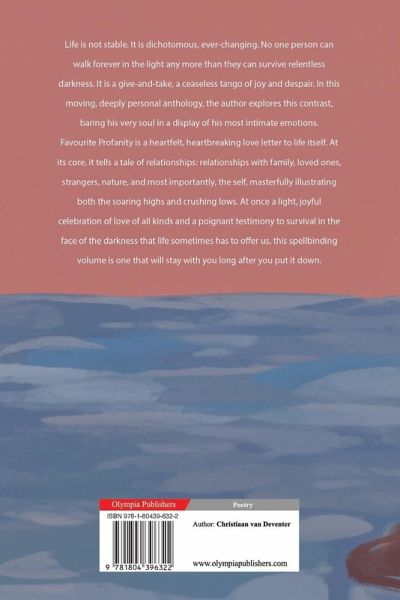 Life is not stable. It is dichotomous, ever-changing. No one person can walk forever in the light any more than they can survive relentless darkness. It is a give-and-take, a ceaseless tango of joy and despair. In this moving, deeply personal anthology, the author explores this contrast, baring his very soul in a display of his most intimate emotions. Favourite Profanity is a heartfelt, heartbreaking love letter to life itself. At its core, it tells a tale of relationships: relationships with family, loved ones, strangers, nature, and most importantly, the self, masterfully illustrating both the soaring highs and crushing lows. At once a light, joyful celebration of love of all kinds and a poignant testimony to survival in the face of the darkness that life sometimes has to offer us, this spellbinding volume is one that will stay with you long after you put it down.
