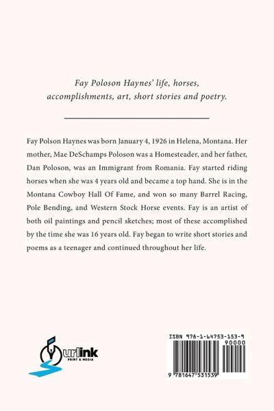 Fay Poloson Haynes’ life, horses, accomplishments, art, short stories and poetry. Fay Polson Haynes was born January 4, 1926 in Helena, Montana. Her mother, Mae DeSchamps Poloson was a Homesteader, and her father, Dan Poloson, was an Immigrant from Romania. Fay started riding horses when she was 4 years old and became a top hand. She is in the Montana Cowboy Hall Of Fame, and won so many Barrel Racing, Pole Bending, and Western Stock Horse events. Fay is an artist of both oil paintings and pencil sketches; most of these accomplished by the time she was 16 years old. Fay began to write short stories and poems as a teenager and continued throughout her life.