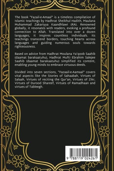 The book "Fazail-e-Amaal" is a timeless compilation of Islamic teachings by Hadhrat Sheikhul Hadith, Maulana Muhammad Zakariyya Kaandhlawi (RA). Renowned globally, it resonates with readers, evoking a profound connection to Allah. Translated into over a dozen languages, it inspires countless individuals. Its teachings transcend borders, touching hearts across languages and guiding numerous souls towards righteousness. Based on advice from Hadhrat Moulana Ya'qoob Saahib (daamat barakaatuhu), Hadhrat Mufti Ebrahim Salejee Saahib (daamat barakaatuhu) simplified its content, enabling young minds to embrace virtuous deeds. Divided into seven sections, "Fazaail-e-Aamaal" covers vital aspects like the Stories of Sahaabah, Virtues of Salaah, Virtues of reciting the Qur'an, Virtues of Zikr, Virtues of Durood Shareef, Virtues of Ramadhaan and virtues of Tableegh.