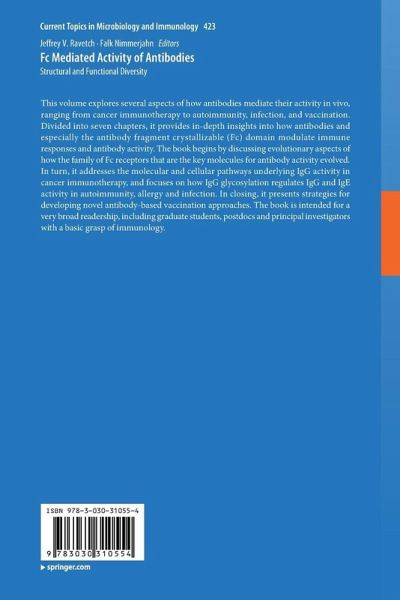 This volume explores several aspects of how antibodies mediate their activity in vivo, ranging from cancer immunotherapy to autoimmunity, infection, and vaccination. Divided into seven chapters, it provides in-depth insights into how antibodies and especially the antibody fragment crystallizable (Fc) domain modulate immune responses and antibody activity. The book begins by discussing evolutionary aspects of how the family of Fc receptors that are the key molecules for antibody activity evolved. In turn, it addresses the molecular and cellular pathways underlying IgG activity in cancer immunotherapy, and focuses on how IgG glycosylation regulates IgG and IgE activity in autoimmunity, allergy and infection. In closing, it presents strategies for developing novel antibody-based vaccination approaches. The book is intended for a very broad readership, including graduate students, postdocs and principal investigators with a basic grasp of immunology.