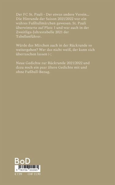 Der FC St. Pauli - Der etwas andere Verein...Die Hinrunde der Saison 2021/2022 war ein wahres Fußballmärchen gewesen. St. Pauli überwinterte auf Platz 1 und war auch in der Zweitliga-Jahrestabelle 2021 der Tabellenführer.Würde das Märchen auch in der Rückrunde so weitergehen? Wer das nicht weiß, der kann sich überraschen lassen (-;Neue Gedichte zur Rückrunde 2021/2022 und dazu noch ein paar ältere Gedichte mit und ohne Fußball-Bezug.