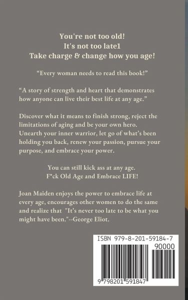 You're not too old and it's not too late! Take charge and change how you age. "Every woman needs to read this book!" "A story of strength and heart that demonstrates how anyone can live their best life at any age." Discover what it means to finish strong, reject the limitations of aging and be your own hero. Unearth your inner warrior, let go of what's been holding you back, renew your passion, pursue your purpose, and embrace your power. You can still kick ass at any age. F*ck Old Age and Embrace LIFE! Joan Maiden enjoys the power to embrace life at every age, encourages other women to do the same and realize that "It's never too late to be what you might have been." --George Eliot.