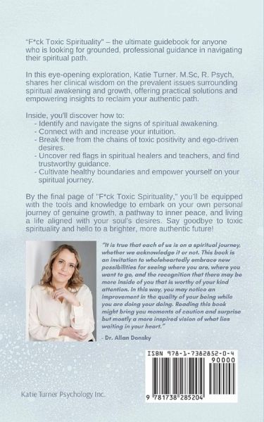 "F*ck Toxic Spirituality" - the ultimate guidebook for anyone who is looking for grounded, professional guidance in navigating their spiritual path. In this eye-opening exploration, Katie Turner. M.Sc, R. Psych, shares her clinical wisdom on the prevalent issues surrounding spiritual awakening and growth, offering practical solutions and empowering insights to reclaim your authentic path. Inside, you'll discover how to: Identify and navigate the signs of spiritual awakening.Connect with and increase your intuition.Break free from the chains of toxic positivity and ego-driven desires.Uncover red flags in spiritual healers and teachers, and find trustworthy guidance.Cultivate healthy boundaries and empower yourself on your spiritual journey. By the final page of "F*ck Toxic Spirituality," you'll be equipped with the tools and knowledge to embark on your own personal journey of genuine growth, a pathway to inner peace, and living a life aligned with your soul's desires. Say goodbye to toxic spirituality and hello to a brighter, more authentic future!