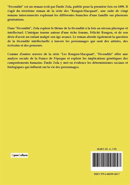 "Fécondité" est un roman d'Émile Zola publié en 1899, qui s'inscrit dans le cadre de sa série inachevée "Les Quatre Évangiles". Ce livre explore les thèmes de la procréation, de la famille et de la société à travers l'histoire de Mathieu Froment et de sa femme Marianne. Le couple, vivant dans une France en pleine mutation économique et sociale, choisit de fonder une famille nombreuse malgré les difficultés financières et les pressions sociales. Zola utilise cette histoire pour critiquer les tendances malthusiennes de l'époque, qui prônaient la limitation des naissances pour éviter la surpopulation et la pauvreté. À travers les épreuves et les triomphes de la famille Froment, Zola met en avant l'idée que la fécondité est une source de transformation et de bonheur, tant pour l'individu que pour la société. Le roman est structuré en six livres, chacun composé de plusieurs chapitres, qui suivent l'évolution de la famille Froment et de leur entourage. Zola y dépeint avec réalisme les défis économiques, les relations interpersonnelles et les idéaux sociaux de la fin du XIXe siècle. "Fécondité" est ainsi une uvre engagée qui invite à réfléchir sur les valeurs familiales et sociales, tout en célébrant la vie et la procréation comme des forces positives et essentielles.