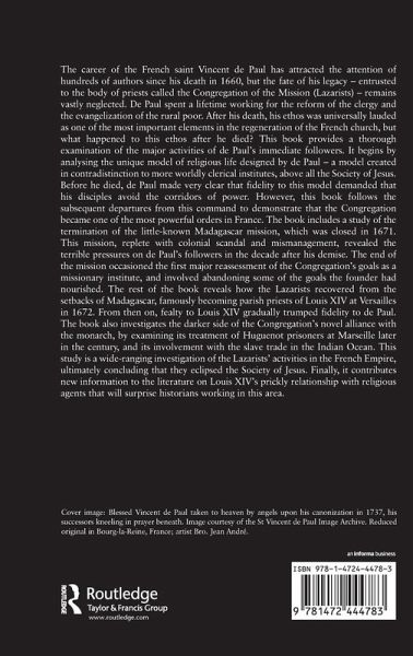 The career of the French saint Vincent de Paul has attracted the attention of hundreds of authors since his death in 1660, but the fate of his legacy - entrusted to the body of priests called the Congregation of the Mission (Lazarists) - remains vastly neglected. De Paul spent a lifetime working for the reform of the clergy and the evangelization of the rural poor. After his death, his ethos was universally lauded as one of the most important elements in the regeneration of the French church, but what happened to this ethos after he died? This book provides a thorough examination of the major activities of de Paul's immediate followers. It begins by analysing the unique model of religious life designed by de Paul - a model created in contradistinction to more worldly clerical institutes, above all the Society of Jesus. Before he died, de Paul made very clear that fidelity to this model demanded that his disciples avoid the corridors of power. However, this book follows the subsequent departures from this command to demonstrate that the Congregation became one of the most powerful orders in France. The book includes a study of the termination of the little-known Madagascar mission, which was closed in 1671. This mission, replete with colonial scandal and mismanagement, revealed the terrible pressures on de Paul's followers in the decade after his demise. The end of the mission occasioned the first major reassessment of the Congregation's goals as a missionary institute, and involved abandoning some of the goals the founder had nourished. The rest of the book reveals how the Lazarists recovered from the setbacks of Madagascar, famously becoming parish priests of Louis XIV at Versailles in 1672. From then on, fealty to Louis XIV gradually trumped fidelity to de Paul. The book also investigates the darker side of the Congregation's novel alliance with the monarch, by examining its treatment of Huguenot prisoners at Marseille later in the century, and its involvement with the slave trade in the Indian Ocean. This study is a wide-ranging investigation of the Lazarists' activities in the French Empire, ultimately concluding that they eclipsed the Society of Jesus. Finally, it contributes new information to the literature on Louis XIV's prickly relationship with religious agents that will surprise historians working in this area.