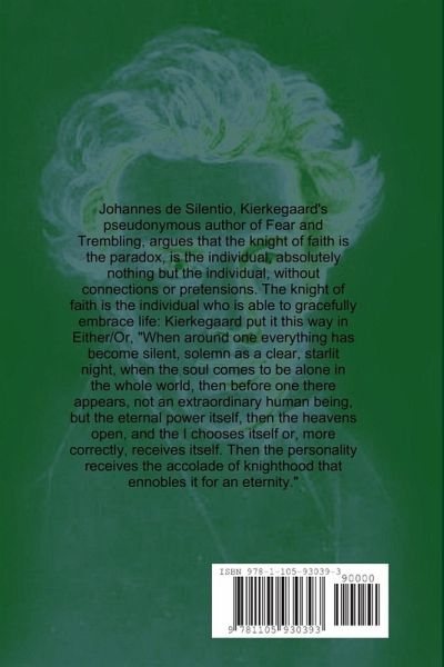 Johannes de Silentio, Kierkegaard's pseudonymous author of Fear and Trembling, argues that the knight of faith is the paradox, is the individual, absolutely nothing but the individual, without connections or pretensions. The knight of faith is the individual who is able to gracefully embrace life: Kierkegaard put it this way in Either/Or, "When around one everything has become silent, solemn as a clear, starlit night, when the soul comes to be alone in the whole world, then before one there appears, not an extraordinary human being, but the eternal power itself, then the heavens open, and the I chooses itself or, more correctly, receives itself. Then the personality receives the accolade of knighthood that ennobles it for an eternity.