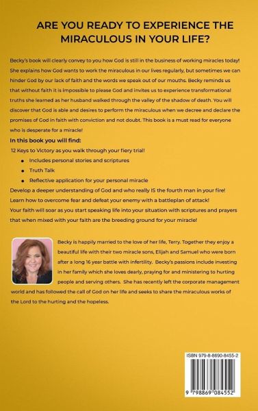 ARE YOU READY TO EXPERIENCE THE MIRACULOUS IN YOUR LIFE? Becky's book will clearly convey to you how God is still in the business of working miracles today! She explains how God wants to work the miraculous in our lives regularly, but sometimes we can hinder God by our lack of faith and the words we speak out of our mouths. Becky reminds us that without faith it is impossible to please God and invites us to experience transformational truths she learned as her husband walked through the valley of the shadow of death. You will discover that God is able and desires to perform the miraculous when we decree and declare the promises of God in faith with conviction and not doubt. This book is a nust read for everyone who is desperate for a miracle! In this book you will find: 12 Keys to Victory as you walk through your fiery trial! ¿ Includes personal stories and scriptures ¿ Truth Talk ¿ Reflective application for your personal miracle Develop a deeper understanding of God and who really IS the fourth man in your fire! Learn how to overcome fear and defeat your enemy with a battleplan of attack! Your faith will soar as you start speaking life into your situation with scriptures and prayers that when mixed with your faith are the breeding ground for your miracle!