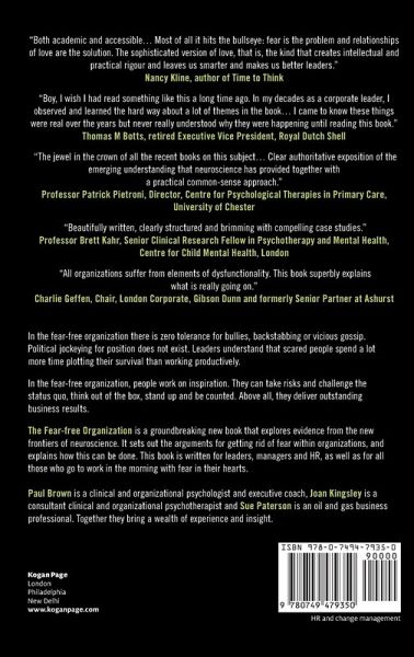 List of figures List of tables About the authors Preface Introduction Part One The person 01 Fear essentials and the development of the Self Introduction We are our emotions What is the brain? Let's get physical: what are feelings? Memories Becoming a person: Change and adaptability Patterns Adaptation References 02 The brain Introduction Pure imagination Welcome to your brain on emotion Contextually speaking The emotion connection So, what makes people different? Emotions deep down inside: Your business card The leader's low road What's trust/love got to do with it? Walking on air References Appendix 2A The triune brain Appendix 2B The emotional brain: Key ingredients Appendix 2C Left brain/right brain Appendix 2D Neurotransmitters and hormones 03 Memories are made of this Introduction What are memories? Once upon a time The faintest ink The eureka effect Creativity by association I remember it well What lies beneath Epigenesis Organizational culture References 04 Relationships Introduction Think again Make or break Being and nothingness Cooperation and collaboration The business of relationships Emotional radar References 05 Trust Introduction Attachment: The foundation of trust Broken trust The gift of fear The neurobiology of trust The trust game In virtual reality we trust Trust me... The power of trust References Part Two The organization, energy flow and profit 06 Fear in the workplace Introduction But first, some definitions Fear in the organization References 07 The nature of energy Introduction Energy and the brain Managing the brain's energy Tracking energy in the organization The 'mind': A working model The fear-free organization References 08 Leaders and HR Introduction Who is accountable? The role of HR in organizations The role of leaders Leaders and HR working relationships References Part Three The future of organizations 09 The role of leadership Introduction What makes a good leader? How do leaders lead? Leadership and the Sofi model Relationships and communications Building a trust-based culture Setting strategy and getting commitment Being a limbic leader in a brain-focused organization Leadership and gender References 10 Change, adaptability and flow Introduction Adaptability and change Seeing and flowing The flow state Different ways of thinking What is the Self? Organizational change programmes Change in a fear-free organization References 11 The fear-free organization Introduction A useful reminder The beginnings of a central unifying theory En-couragement Proposed design spec for a fear-free organization References Endnote Index