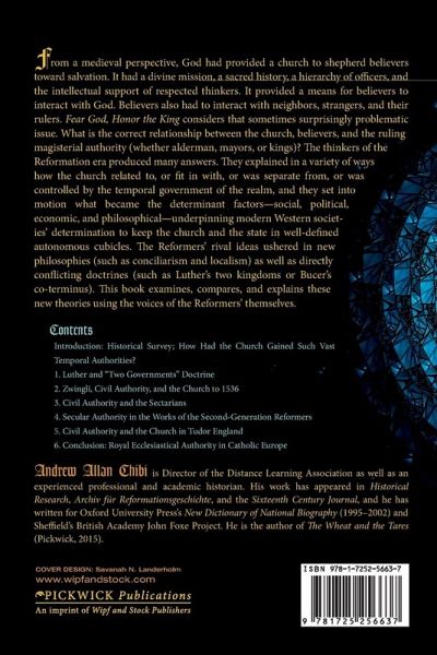 From a medieval perspective, God had provided a church to shepherd believers toward salvation. It had a divine mission, a sacred history, a hierarchy of officers, and the intellectual support of respected thinkers. It provided a means for believers to interact with God. Believers also had to interact with neighbors, strangers, and their rulers. Fear God, Honor the King considers that sometimes surprisingly problematic issue. What is the correct relationship between the church, believers, and the ruling magisterial authority (whether alderman, mayors, or kings)? The thinkers of the Reformation era produced many answers. They explained in a variety of ways how the church related to, or fit in with, or was separate from, or was controlled by the temporal government of the realm, and they set into motion what became the determinant factors--social, political, economic, and philosophical--underpinning modern Western societies' determination to keep the church and the state in well-defined autonomous cubicles. The Reformers' rival ideas ushered in new philosophies (such as conciliarism and localism) as well as directly conflicting doctrines (such as Luther's two kingdoms or Bucer's co-terminus). This book examines, compares, and explains these new theories using the voices of the Reformers' themselves.