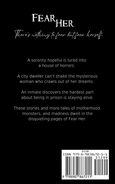 A sorority hopeful is lured into a house of horrors. A city dweller can't shake the mysterious woman who crawls out of her dreams. An inmate discovers the hardest part about being in prison is staying alive. These stories and more tales of motherhood, monsters, and madness dwell in the disquieting pages of Fear Her. Forward by Wendy Dalrymple, author of Roser Park and White Ibis. Includes the following stories: 1. Drawing Flies 2. X 3. Harvest 4. Those Who Wish to be Clean 5. Dirt 6. The Lovebugs 7. Daughters 8. Black Moose 9. Why She Dreams of Alligators 10. Lovely 11. End of Day 12. Tourniquet