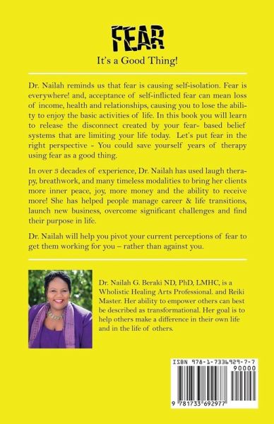 Dr. Nailah reminds us that fear is causing self-isolation. Fear is everywhere, and acceptance of self-inflicted fear can mean loss of income, health and relationships, causing you to lose the ability to enjoy the basic activities of life. In this book, you will learn to release the disconnect created by your fear-based belief systems that are limiting your life today. Let's put fear in the right perspective-you could save yourself years of therapy using fear as a good thing. In over three decades of experience, Dr. Nailah has used laugh therapy, breathwork, and many timeless modalities to bring her clients more inner peace, joy, more money and the ability to receive more! She has helped people manage career and life transitions, launch new business, overcome significant challenges and find their purpose in life. Dr. Nailah will help you pivot your current perceptions of fear to get them working for you-rather than against you.