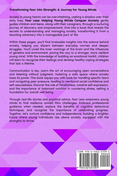 Transforming Fear into Strength: A Journey for Young Minds Anxiety in young hearts can be overwhelming, casting a shadow over their daily lives. Fear Less: Helping Young Minds Conquer Anxiety gently guides children and teens, along with their caregivers, through a nurturing journey of discovery and empowerment. Dive into a book that reveals the secrets to understanding and managing anxiety, transforming it from a daunting adversary into a manageable part of life. Within these pages, you'll find invaluable insights into the science behind anxiety, helping you discern between everyday worries and deeper struggles. You'll unveil the inner workings of the brain and the influences of genetics and environment, paving the way to a stronger, more resilient young mind. With the knowledge of building an emotional toolkit, children will learn to recognize their feelings and develop healthy coping strategies that last a lifetime. Communication is key. Learn the art of encouraging open conversations and listening without judgment, fostering a safe space where anxiety loses its power. This book equips you with tools for handling specific fears and navigating peer pressure, leading to newfound social confidence and self-assuredness. Discover the role of mindfulness, creative self-expression, and the importance of balanced nutrition in countering stress, setting a foundation for overall well-being. Through real-life stories and practical advice, Fear Less empowers young minds to find resilience amidst life's challenges. Embrace professional guidance when needed, explore the benefits of cognitive behavioral techniques, and recognize the importance of celebrating progress. Together, let's nurture confidence and independence, building a brighter future where young individuals rise above anxiety, equipped with the strengths to thrive.
