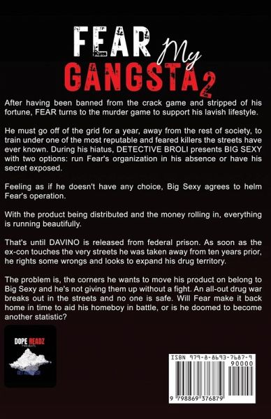 FEAR MY GANGSTA 2 After having been banned from the crack game and stripped of his fortune, FEAR turns to the murder game to support his lavish lifestyle. He must go off of the grid for a year, away from the rest of society, to train under one of the most reputable and feared killers the streets have ever known. During his hiatus, DETECTIVE BROLI presents BIG SEXY with two options: run Fear's organization in his absence or have his secret exposed. Feeling as if he doesn't have any choice, Big Sexy agrees to helm Fear's operation. With the product being distributed and the money rolling in, everything is running beautifully. That's until DAVINO is released from federal prison. As soon as the ex-con touches the very streets he was taken away from ten years prior, he rights some wrongs and looks to expand his drug territory. The problem is, the corners he wants to move his product on belong to Big Sexy and he's not giving them up without a fight. An all-out drug war breaks out in the streets and no one is safe. Will Fear make it back home in time to aid his homeboy in battle, or is he doomed to become another statistic?