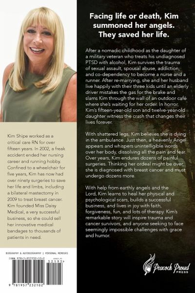 Facing life or death, Kim summoned her angels. They saved her life. After a nomadic childhood as the daughter of a military veteran who treats his undiagnosed PTSD with alcohol, Kim survives the trauma of sexual assault, spousal abuse, addiction, and co-dependency to become a nurse and a runner. After re-marrying, she and her husband live happily with their three kids until an elderly driver mistakes the gas for the brake and slams Kim through the wall of an outdoor café where she's waiting for her order. In horror, Kim's fifteen-year-old son and twelve-year-old daughter witness the crash that changes their lives forever. With shattered legs, Kim believes she is dying in the ambulance. Just then, a heavenly Angel appears and whispers unintelligible words over her body, dissolving all the pain and fear. Over many years, Kim endures dozens of painful surgeries. When she thinks her ordeal might be over, she is diagnosed with breast cancer and must undergo dozens more. Despite her physical and psychological scars, Kim maintains her faith and strength with the support and compassion of earthly angels--her husband, children, mother, friends, and extended family. With their help and that of the Lord, she learns to heal, builds a successful business, and lives in joy with faith, forgiveness, fun, and lots of therapy. Kim's remarkable story will inspire trauma and cancer survivors, as well as anyone seeking to face seemingly impossible challenges with grace and humor.