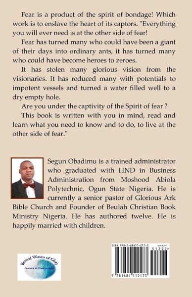 Fear is a product of the spirit of bondage! Which work is to enslave the heart of its captors. "Everything you will ever need is at the other side of fear! Fear has turned many who could have been a giant of their days into ordinary ants, it has turned many who could have become heroes to zeroes. It has stolen many glorious vision from the visionaries. It has reduced many with potentials to impotent vessels and turned a water filled well to a dry empty hole. Are you under the captivity of the Spirit of fear? This book is written with you in mind, read and learn what you need to know and to do, to live at the other side of fear."