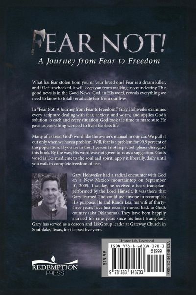 What has fear stolen from you or your loved one? Fear is a dream killer, and if left unchecked, it will keep you from walking in your destiny. The good news is in the Good News. God, in His word, reveals everything we need to know to totally eradicate fear from our lives. In "Fear Not! A Journey from Fear to Freedom," Gary Hohweiler examines every scripture dealing with fear, anxiety, and worry, and applies God's solution to each and every situation. God took the time to make sure He gave us everything we need to live a fearless life. Many of us treat God's word like the owner's manual in our car. We pull it out only when we have a problem. Well, fear is a problem for 99.9 percent of the population. If you are in the .1 percent not impacted, please disregard this book. By the way, His word was not given to us as a suggestion. God's word is like medicine to the soul and spirit: apply it liberally, daily until you walk in complete freedom of fear. Gary Hohweiler had a radical encounter with God on a New Mexico mountaintop on September 10, 2005. That day, he received a heart transplant performed by the Lord Himselt. It was there that Gary learned God could use anyone to accomplish His purpose. He and Randa Lea, his wife of thirty-three years, have just recently moved back to God's country (aka Oklahoma). They have been happily married for nine years since his heart transplant. Gary has served as a deacon and LifeGroup leader at Gateway Church in Southlake, Texas, for the past five years.