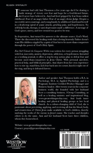 If someone had told Ami Thomson a few years ago she'd be sharing a battle strategy of victory over fear and hope for a God-blessed future, she'd never have believed it. Ami had lived gripped by fear from earliest childhood. Fear of an angry father. Fear of an angry divine Judge. Despite a successful career, marriage, and young family, by adulthood Ami found herself in a death-trap spiral of panic attacks, grueling pain, and hopelessness. No self-help books, therapy, or anti-depressants made a difference. A message of God's grace, mercy, and love seemed too good to be true. In desperation, Ami turned for answers to the ultimate source, God's Word. There she discovered the healing truth that a loving heavenly Father doesn't want His children crippled by a spirit of fear but to be more-than-conquerors through the power of God's Holy Spirit. Fear Not! Unleash the Conqueror Within was written for every person struggling with fear, insecurity, anxiety, depression, addiction, or hopelessness. Intended as a working journal, it offers a step-by-step action plan to defeat fear and become more-than-conquerors in Jesus Christ. With personal anecdote, practical help, and biblical principles, Ami shares from her own experience how to rise up, stand firm, kick fear back into its corner, knock it right out of the ring, and keep it defeated forever.