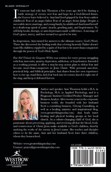 If someone had told Ami Thomson a few years ago she'd be sharing a battle strategy of victory over fear and hope for a God-blessed future, she'd never have believed it. Ami had lived gripped by fear from earliest childhood. Fear of an angry father. Fear of an angry divine Judge. Despite a successful career, marriage, and young family, by adulthood Ami found herself in a death-trap spiral of panic attacks, grueling pain, and hopelessness. No self-help books, therapy, or anti-depressants made a difference. A message of God's grace, mercy, and love seemed too good to be true. In desperation, Ami turned for answers to the ultimate source, God's Word. There she discovered the healing truth that a loving heavenly Father doesn't want His children crippled by a spirit of fear but to be more-than-conquerors through the power of God's Holy Spirit. Fear Not! Unleash the Conqueror Within was written for every person struggling with fear, insecurity, anxiety, depression, addiction, or hopelessness. Intended as a working journal, it offers a step-by-step action plan to defeat fear and become more-than-conquerors in Jesus Christ. With personal anecdote, practical help, and biblical principles, Ami shares from her own experience how to rise up, stand firm, kick fear back into its corner, knock it right out of the ring, and keep it defeated forever.