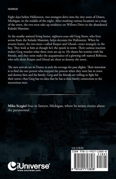 Eight days before Halloween, two strangers drive into the tiny town of Dunes, Michigan, in the middle of the night. After marking various locations on a map of the town, the two men take up residence on Willows Drive in the abandoned Kalaski Mansion. At the nearby assisted living home, eighteen-year-old Greg Snow, who lives across from the Kalaski Mansion, helps decorate for Halloween. When he returns home, the two men-called Kasper and Ghoul-react strangely to the boy. They look at him as though he's the spook in town. Their curious reaction makes Greg wonder what these men are up to. He shares his worries with his friends, and they soon make the acquaintance of a glowing orb named Rebecca, who tells them Kasper and Ghoul are there to destroy the town. The new arrivals are in Dunes to seek the revenge for past slights. Their intention is to find the one person who stopped the process when they were last in town and destroy him and his family. Greg and his friends are willing to fight for their town-but Greg has no idea that he has a close family connection to the mysterious men.
