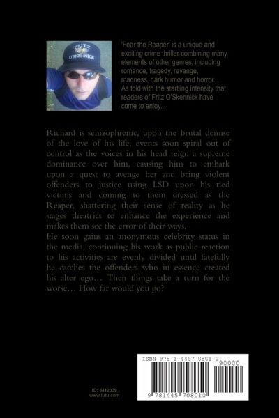 Fear the Reaper' is a unique and exciting crime thriller combining many elements of other genres, including romance, tragedy, revenge, madness, dark humor and horror... As told with the startling intensity that readers of Fritz O'Skennick have come to enjoy... Richard is schizophrenic, upon the brutal demise of the love of his life, events soon spiral out of control as the voices in his head reign a supreme dominance over him, causing him to embark upon a quest to avenge her and bring violent offenders to justice using LSD upon his tied victims and coming to them dressed as the Reaper, shattering their sense of reality as he stages theatrics to enhance the experience and makes them see the error of their ways. He soon gains an anonymous celebrity status in the media, continuing his work as public reaction to his activities are evenly divided until fatefully he catches the offenders who in essence created his alter ego... Then things take a turn for the worse... How far would you go?