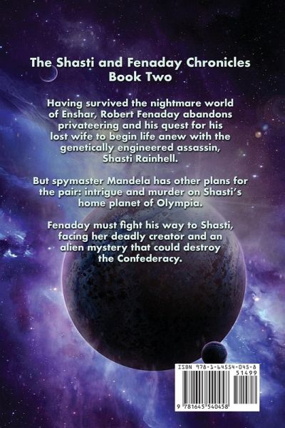 Having survived the nightmare world of Enshar, Robert Fenaday abandons privateering and his quest for his lost wife to begin life anew with the genetically engineered assassin, Shasti Rainhell. But spymaster Mandela has other plans for the pair: intrigue and murder on Shasti’s home planet of Olympia. Fenaday must fight his way to Shasti, facing her deadly creator and an alien mystery that could destroy the Confederacy.