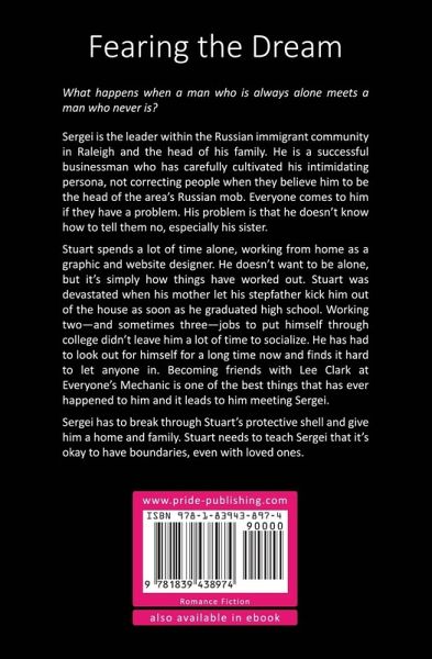 What happens when a man who is always alone meets a man who never is? Sergei is the leader within the Russian immigrant community in Raleigh and the head of his family. He is a successful businessman who has carefully cultivated his intimidating persona, not correcting people when they believe him to be the head of the area's Russian mob. Everyone comes to him if they have a problem. His problem is that he doesn't know how to tell them no, especially his sister. Stuart spends a lot of time alone, working from home as a graphic and website designer. He doesn't want to be alone, but it's simply how things have worked out. Stuart was devastated when his mother let his stepfather kick him out of the house as soon as he graduated high school. Working two-and sometimes three-jobs to put himself through college didn't leave him a lot of time to socialize. He has had to look out for himself for a long time now and finds it hard to let anyone in. Becoming friends with Lee Clark at Everyone's Mechanic is one of the best things that has ever happened to him and it leads to him meeting Sergei. Sergei has to break through Stuart's protective shell and give him a home and family. Stuart needs to teach Sergei that it's okay to have boundaries, even with loved ones.