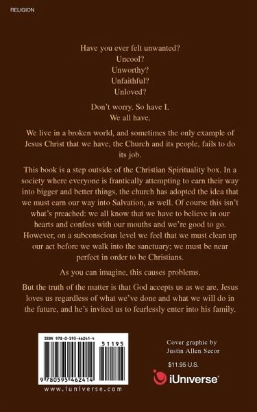 Have you ever felt unwanted? Uncool? Unworthy? Unfaithful? Unloved? Don't worry. So have I. We all have. We live in a broken world, and sometimes the only example of Jesus Christ that we have, the Church and its people, fails to do its job. This book is a step outside of the Christian Spirituality box. In a society where everyone is frantically attempting to earn their way into bigger and better things, the church has adopted the idea that we must earn our way into Salvation, as well. Of course this isn't what's preached: we all know that we have to believe in our hearts and confess with our mouths and we're good to go. However, on a subconscious level we feel that we must clean up our act before we walk into the sanctuary; we must be near perfect in order to be Christians. As you can imagine, this causes problems. But the truth of the matter is that God accepts us as we are. Jesus loves us regardless of what we've done and what we will do in the future, and he's invited us to fearlessly enter into his family.