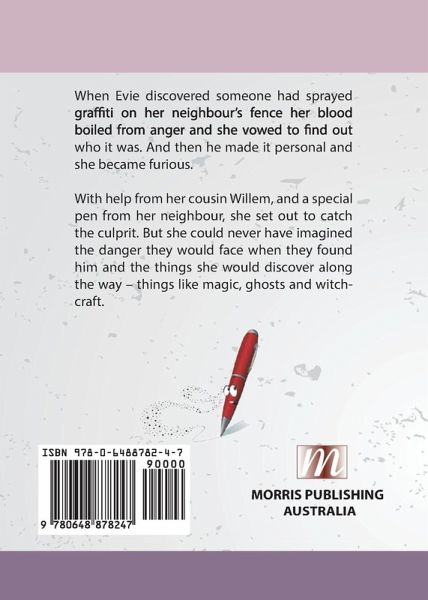 When Evie discovered someone had sprayed graffiti on her neighbour's fence her blood boiled from anger and she vowed to find out who it was. And then he made it personal and she became furious. With help from her cousin Willem, and a special pen from her neighbour, she set out to catch the culprit. But she could never have imagined the danger they would face when they found him and the things she would discover along the way - things like magic, ghosts and witchcraft.