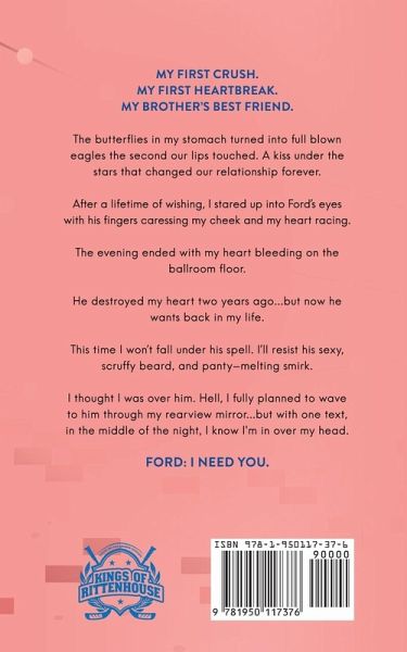 My first crush. My first heartbreak. My brother's best friend. The butterflies in my stomach turned into full blown eagles the second our lips touched. A kiss under the stars that changed our relationship forever. After a lifetime of wishing, I stared up into Ford's eyes with his fingers caressing my cheek and my heart racing. The evening ended with my heart bleeding on the ballroom floor. He destroyed my heart two years ago...but now he wants back in my life. This time I won't fall under his spell. I'll resist his sexy, scruffy beard, and panty-melting smirk. I thought I was over him. Hell, I fully planned to wave to him through my rearview mirror...but with one text, in the middle of the night, I know I'm in over my head. Ford: I need you.