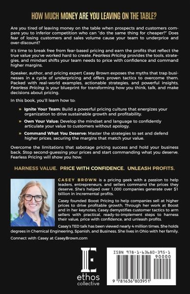 How much money are you leaving on the table? Are you tired of leaving money on the table when prospects and customers compare you to inferior competition who can "do the same thing for cheaper?" Does fear of losing customers and sales volume cause your team to underprice and over-discount? It's time to break free from fear-based pricing and earn the profits that reflect the true value you've worked hard to create. Fearless Pricing provides the tools, strategies, and mindset shifts your team needs to price with confidence and command higher margins. Speaker, author, and pricing expert Casey Brown exposes the myths that trap businesses in a cycle of underpricing and offers proven tactics to overcome them. Packed with real-world examples, actionable strategies, and powerful insights, Fearless Pricing is your blueprint for transforming how you think, talk, and make decisions about pricing. In this book, you'll learn how to: Ignite Your Team: Build a powerful pricing culture that energizes your organization to drive sustainable growth and profitability. Own Your Value: Develop the mindset and language to confidently articulate your value to customers without apology. Command What You Deserve: Master the strategies to set and defend higher prices, securing the margins that match your value. Overcome the limitations that sabotage pricing success and hold your business back. Stop second-guessing your prices and start commanding what you deserve. Fearless Pricing will show you how. Harness value. Price with confidence. Unleash profits.