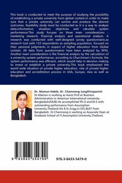 This book is conducted to meet the purpose of studying the possibility of establishing a private university from global context.In order to make sure that a private university can survive and produce the desired outcomes, feasibility study must be conducted as it is a way to analyze data,information, situation, objectives and calculate system performance.This study focuses on three main considerations - marketing research, financial analysis and operational analysis. A research was conducted with well-designed survey questionnaire,as research tool with 132 respondents as sampling population, focused on their personal judgments in respect of higher education from Global context. All data from questionnaires have been analyzed by SPSS. Another main consideration is the financial analysis by the calculation of a university system performance, according to Churchman's formula; the system performance was efficient, which would help in decision making to invest or establish a private university.This book emphasized the world wide situation of private higher education, role of private higher education and accreditation process in USA, Europe, Asia as well as Bangladesh.