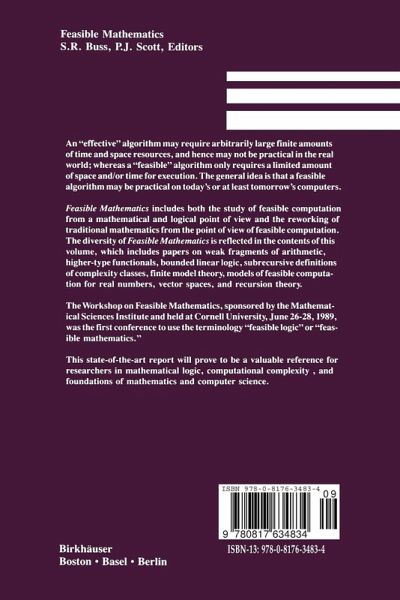 A so-called "effective" algorithm may require arbitrarily large finite amounts of time and space resources, and hence may not be practical in the real world. A "feasible" algorithm is one which only requires a limited amount of space and/or time for execution; the general idea is that a feasible algorithm is one which may be practical on today's or at least tomorrow's computers. There is no definitive analogue of Church's thesis giving a mathematical definition of feasibility; however, the most widely studied mathematical model of feasible computability is polynomial-time computability. Feasible Mathematics includes both the study of feasible computation from a mathematical and logical point of view and the reworking of traditional mathematics from the point of view of feasible computation. The diversity of Feasible Mathematics is illustrated by the. contents of this volume which includes papers on weak fragments of arithmetic, on higher type functionals, on bounded linear logic,on sub recursive definitions of complexity classes, on finite model theory, on models of feasible computation for real numbers, on vector spaces and on recursion theory. The vVorkshop on Feasible Mathematics was sponsored by the Mathematical Sciences Institute and was held at Cornell University, June 26-28, 1989.